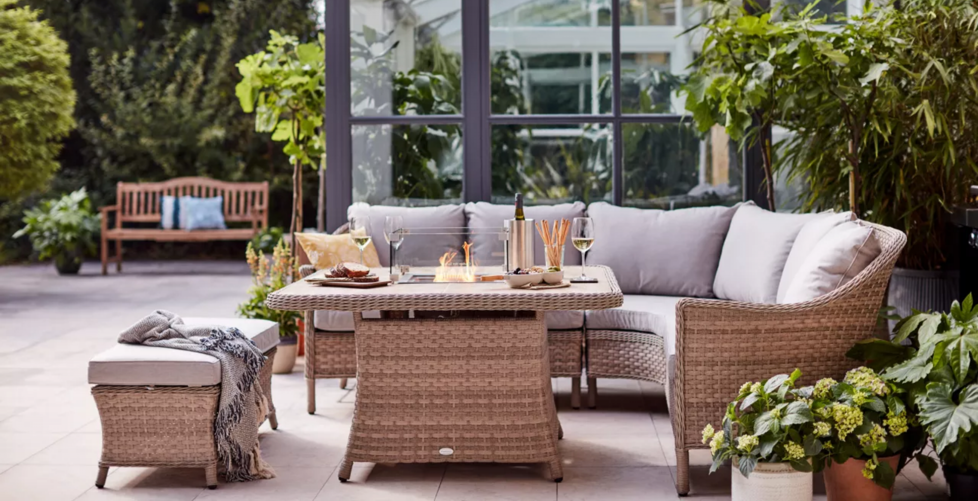We offer all types of garden furniture, from rattan sofa dining sets to outdoor gas fire pits and parasols.