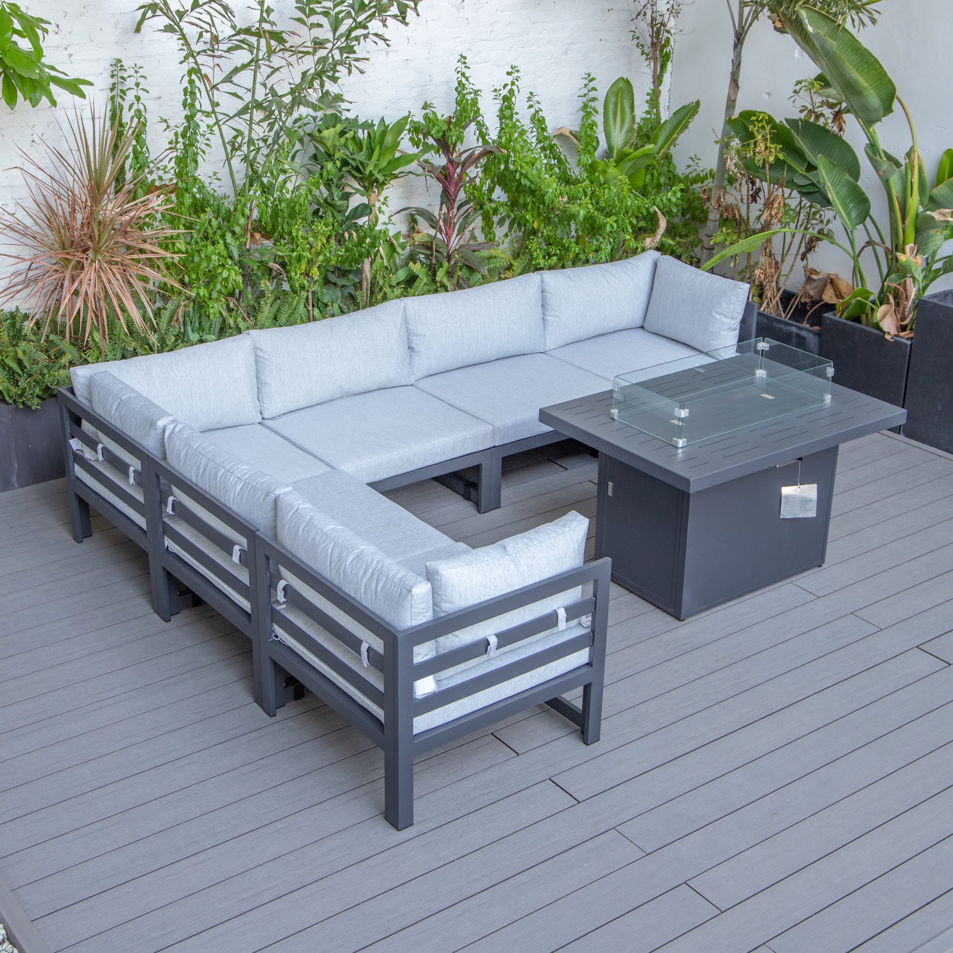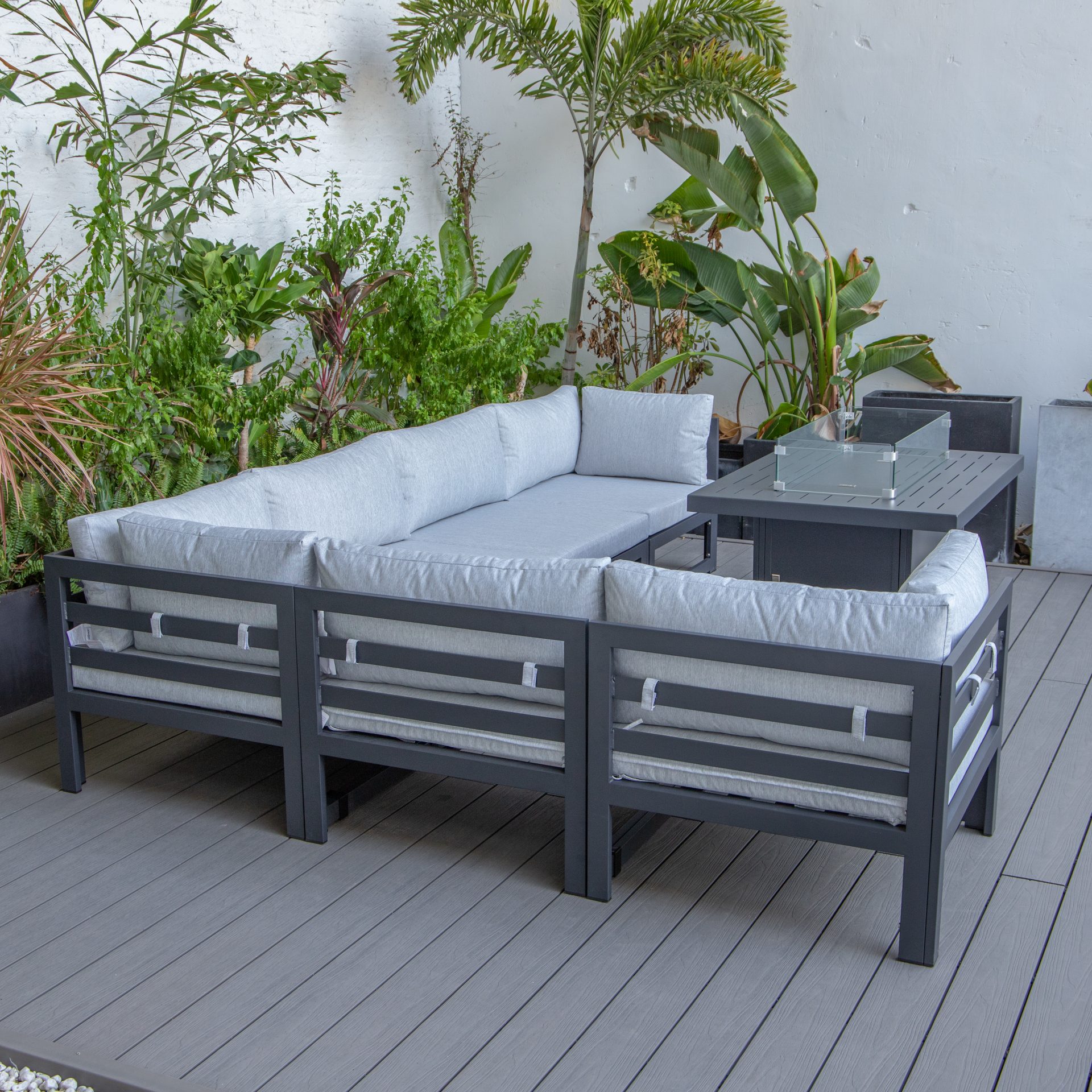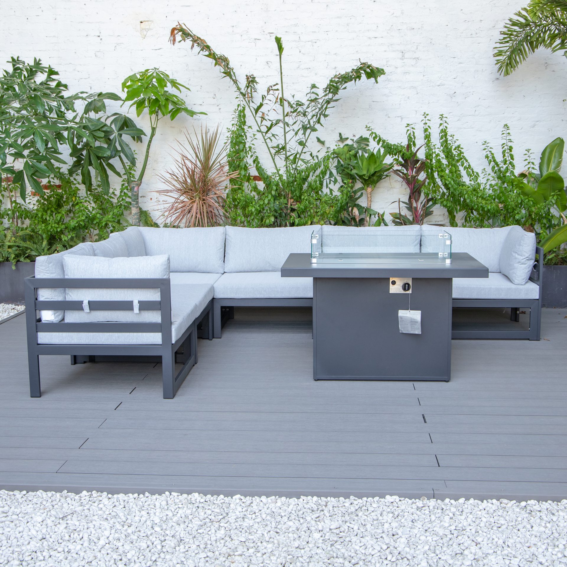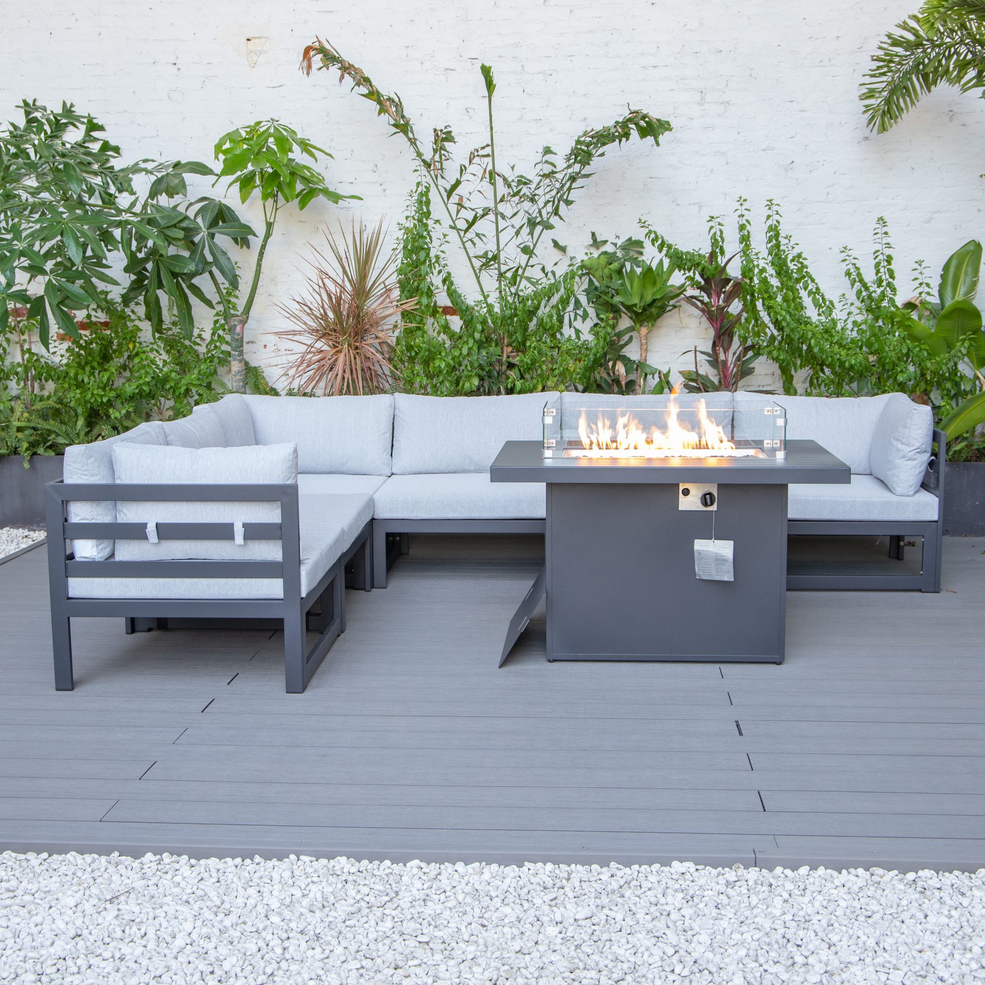 The Cheltenham sofa set is carefully designed to give our lovely customers the ultimate outdoor lounging experience. The set is equipped with a CE certified propane fire pit table with auto-ignition, which will provide you warmth on those slightly colder evenings without worrying about the messy ashes.