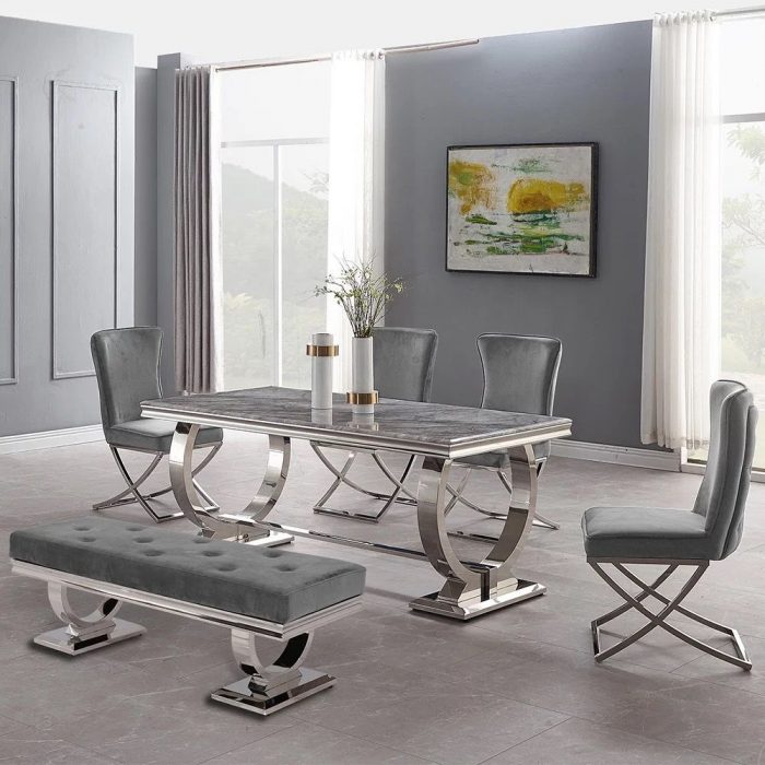 The Richmond is a contemporary dining table set featuring a marble top with polished stainless steel base. Richmond dining set is perfect for family and friends gatherings. With its refined yet bold style, this collection is sure to turn head and dazzle guests.